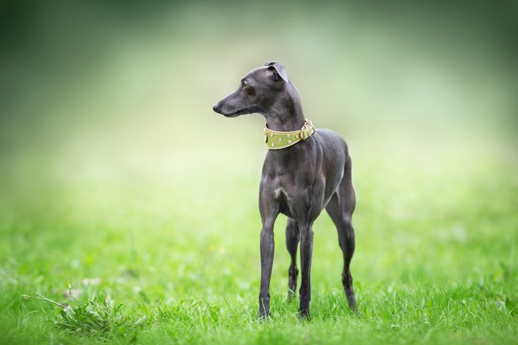 Italian Greyhound standing in the grass.