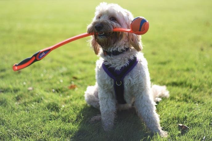Sometimes, all your dog needs to have a good time is a few toys. Consider adding a Chuck-It! Ball Launcher to your backyard, which lets you throw a ball farther and with less effort, keeping the game going longer without getting tired. For added fun, try using water balloons or pool toys in the summer to cool off your pup during fetch sessions.